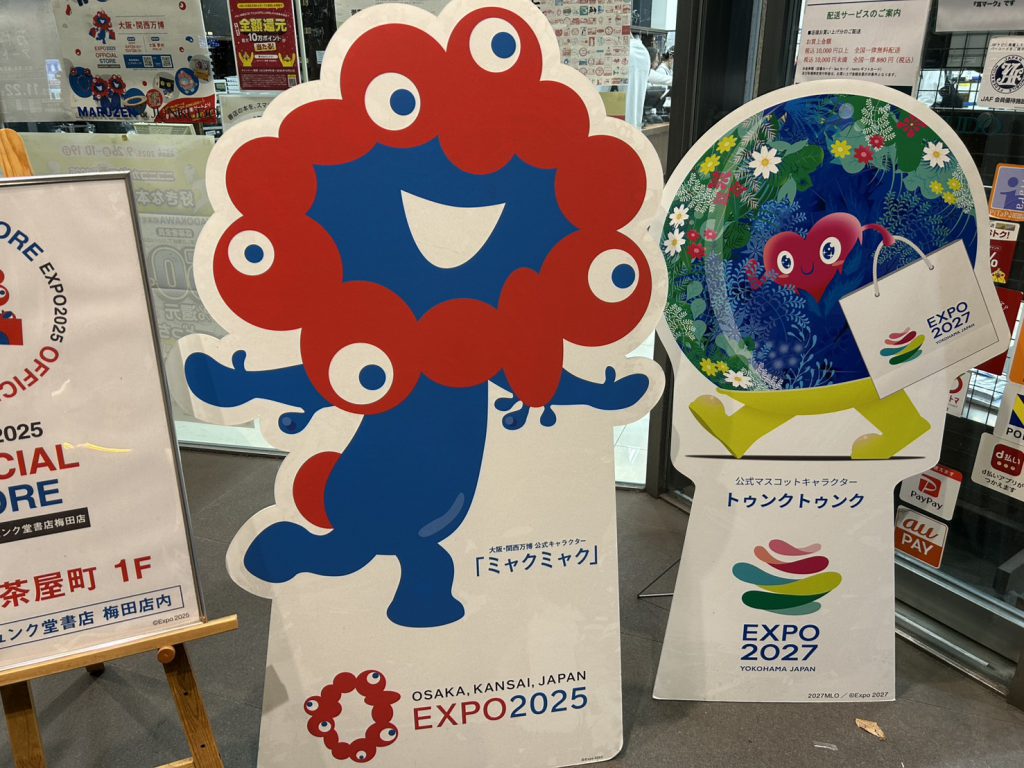 大阪の街も少し寂しくなるかな…と思いきや、うちの近所でもすでに、2027年に横浜で開催される「国際園芸博覧会(花博)」の“トゥンクトゥンク”と“ミャクミャク”のコラボ?引継ぎが始まっています。