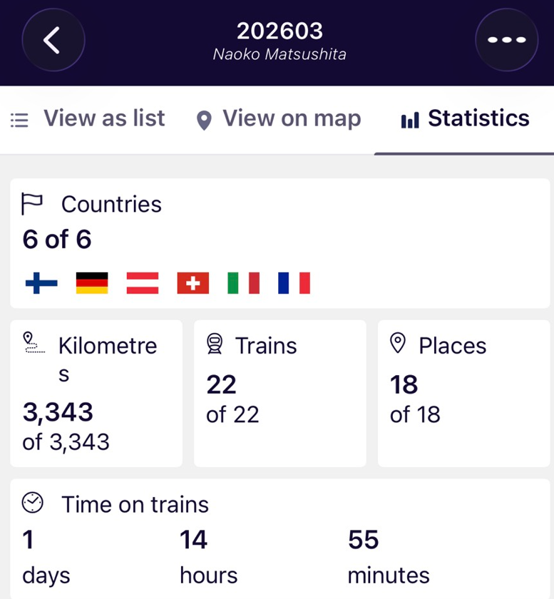 この2週間…総距離 3,343㎞(日本縦断+α)、計約39時間列車に揺られて、8ヵ国(フィンランド、ドイツ、オーストリア、リヒテンシュタイン、スイス、モナコ、イタリア、サンマリノ)、13都市。※この後、バチカン行くから9ヵ国になる