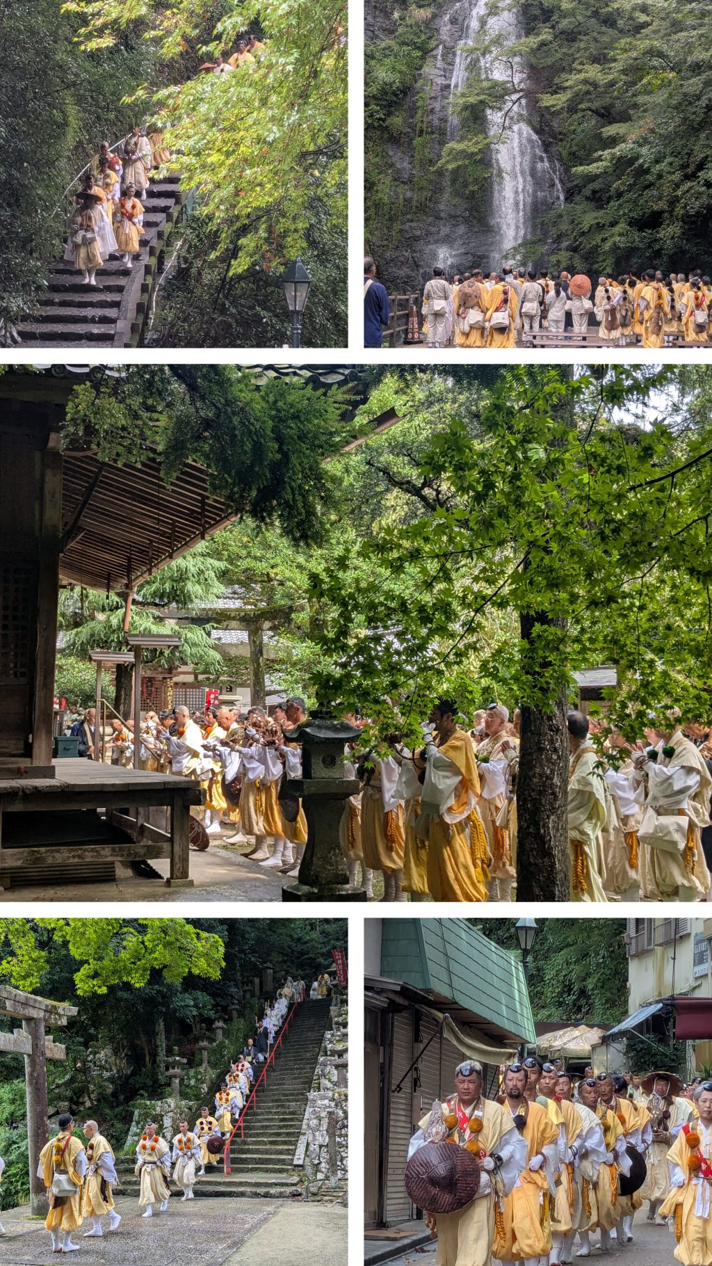 滝前で待っていると、今まで降っていた雨がぴたりと止み、間もなく遠くの方からほら貝の響きが聞こえてきました。総勢80名ほどの山伏さんが行列をなして階段を下りてくる様は圧巻でした。